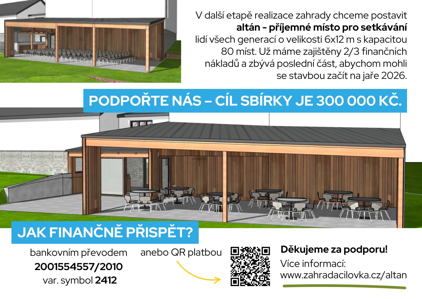 Moto letošní veřejné sbírky „SPOLEČNĚ POD JEDNOU STŘECHOU“, vyjadřuje naše přání, aby se komunitní altán stal místem setkávání lidí všech generací. Společnost je rozdělena, my chceme vytvářet prostor, kde by se lidé mohli vzájemně potkávat, propojit. To je i POSLÁNÍM zahrady Cílovka: „Vytvořit unikátní místo komunitní zahrady, kde se lidé všech generací propojují, seznamují, inspirují a prožívají zájem. Je to místo setkávání, zábavy, odpočinku a rozjímání.“